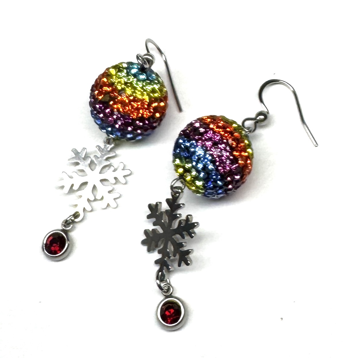 Extra glitzernde Ohrringe mit Discoperle aus Polymerton mit Strassbesatz, Schneeflocke aus Edelstahl und kleinem Anhänger. Französischer Ohrhaken.