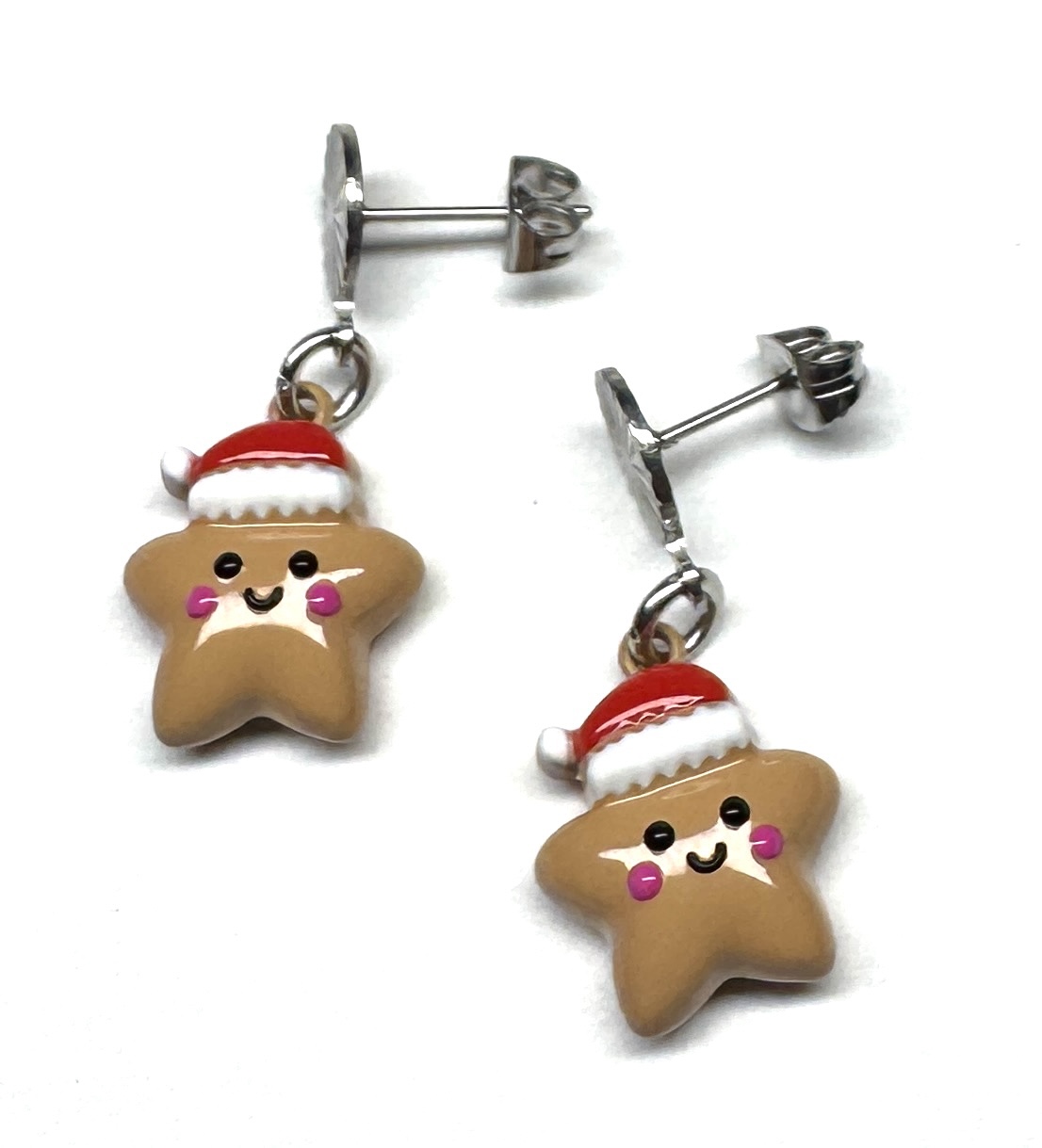 Ohrringe aus Edelstahl mit emailliertem, detailreichem Anhänger in Sternchenform. Der Anhänger besteht im Kern aus Metall, durch den Überzug aus Emaille kommt dieses jedoch nicht mit der Haut in Berührung. Ohrmutterverschluss.