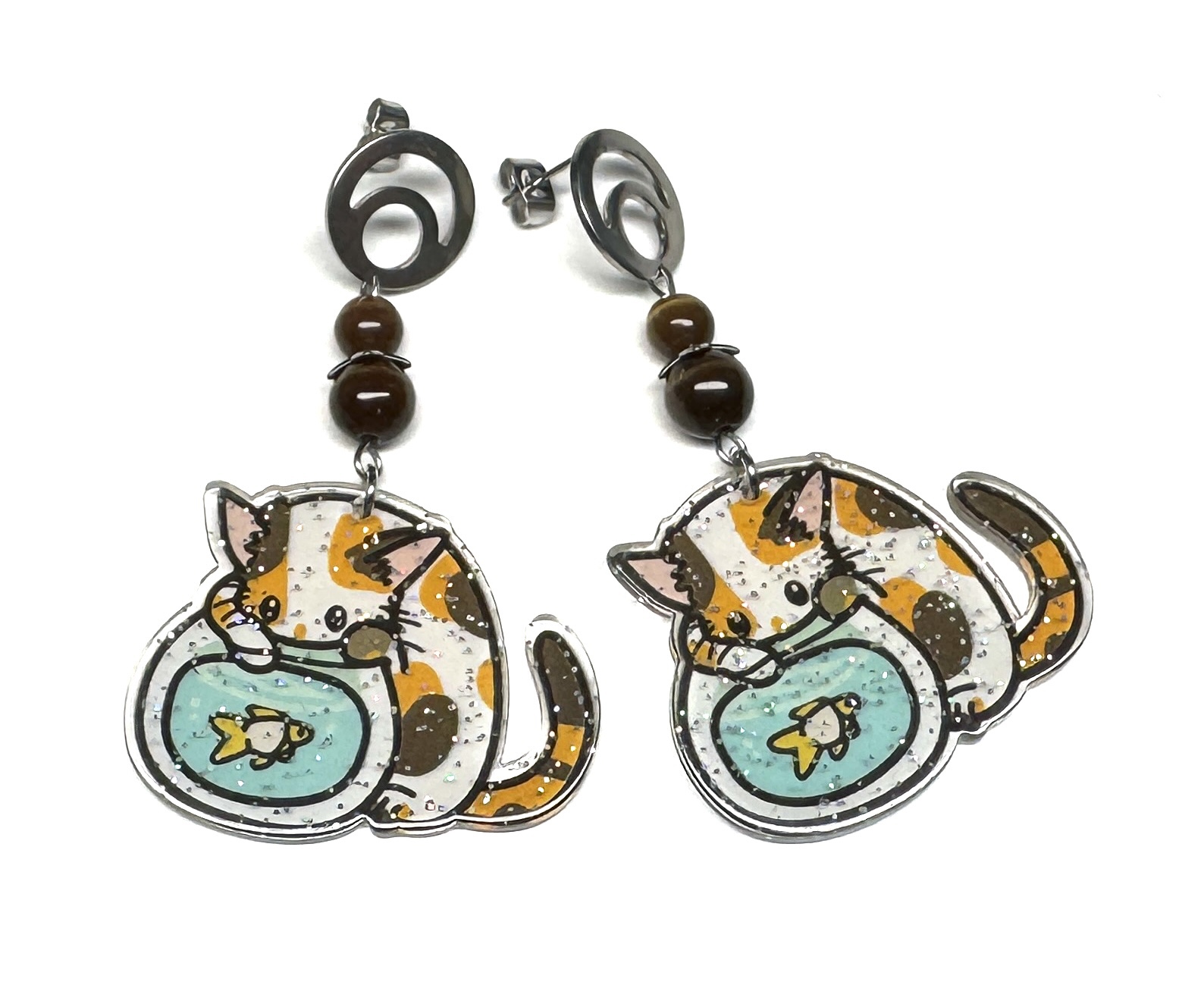 Zuckersüße, glitzernde Anhänger aus Acryl, Glas-Cateye-Perlen, Edelstahlperlkappe und ein Ohrstecker aus Edelstahl mit Ohrmutterverschluss.