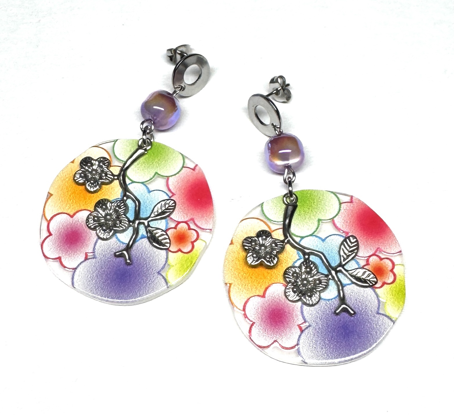 Ohrringe aus Edelstahl mit wunderschönem Acryl-Anhänger, Blütenzweig aus Edelstahl und unglaublich glänzender Resin-Perle.