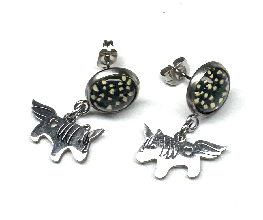 Kleine Ohrstecker aus Edelstahl mit Glas-Cabochon und Edelstahlanhänger. Ohrmutterverschluss.