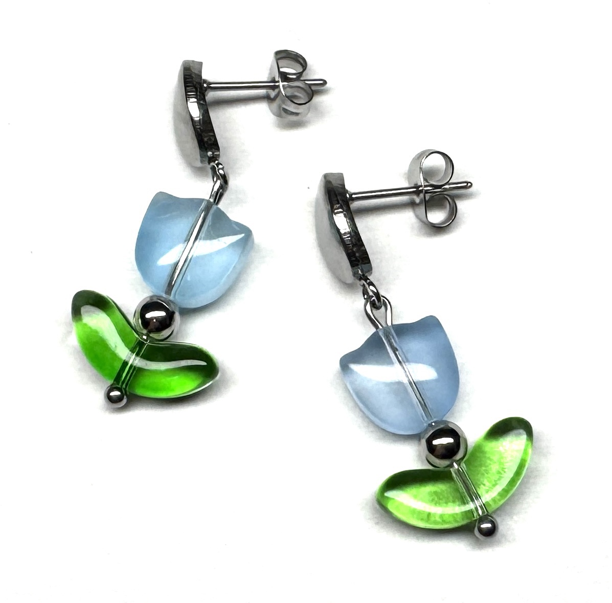 Ohrringe in Tulpenform mit Glas- und Edelstahlperlen. Ohrmutterverschluss.