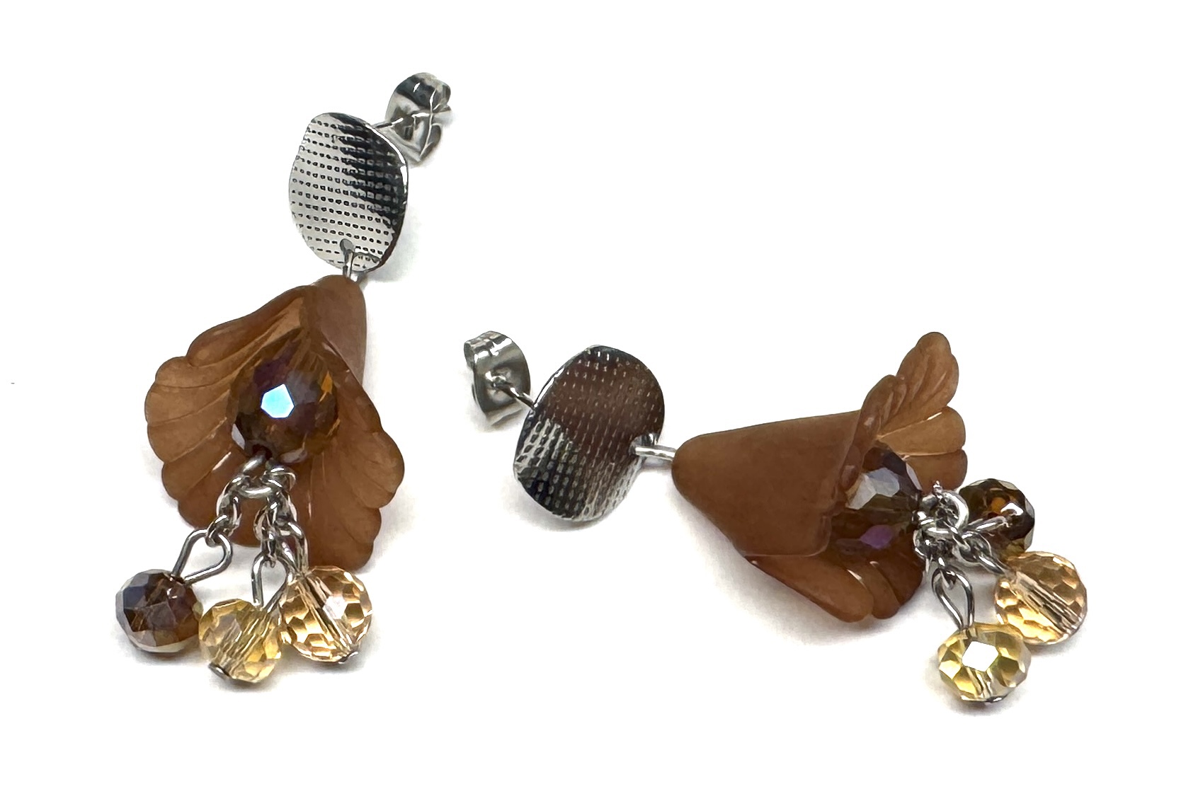 Ohrringe mit Blütenkelch aus Acryl und verschiedenen, facettierten Glasperlen auf Edelstahlkette. Ohrmutterverschluss.
