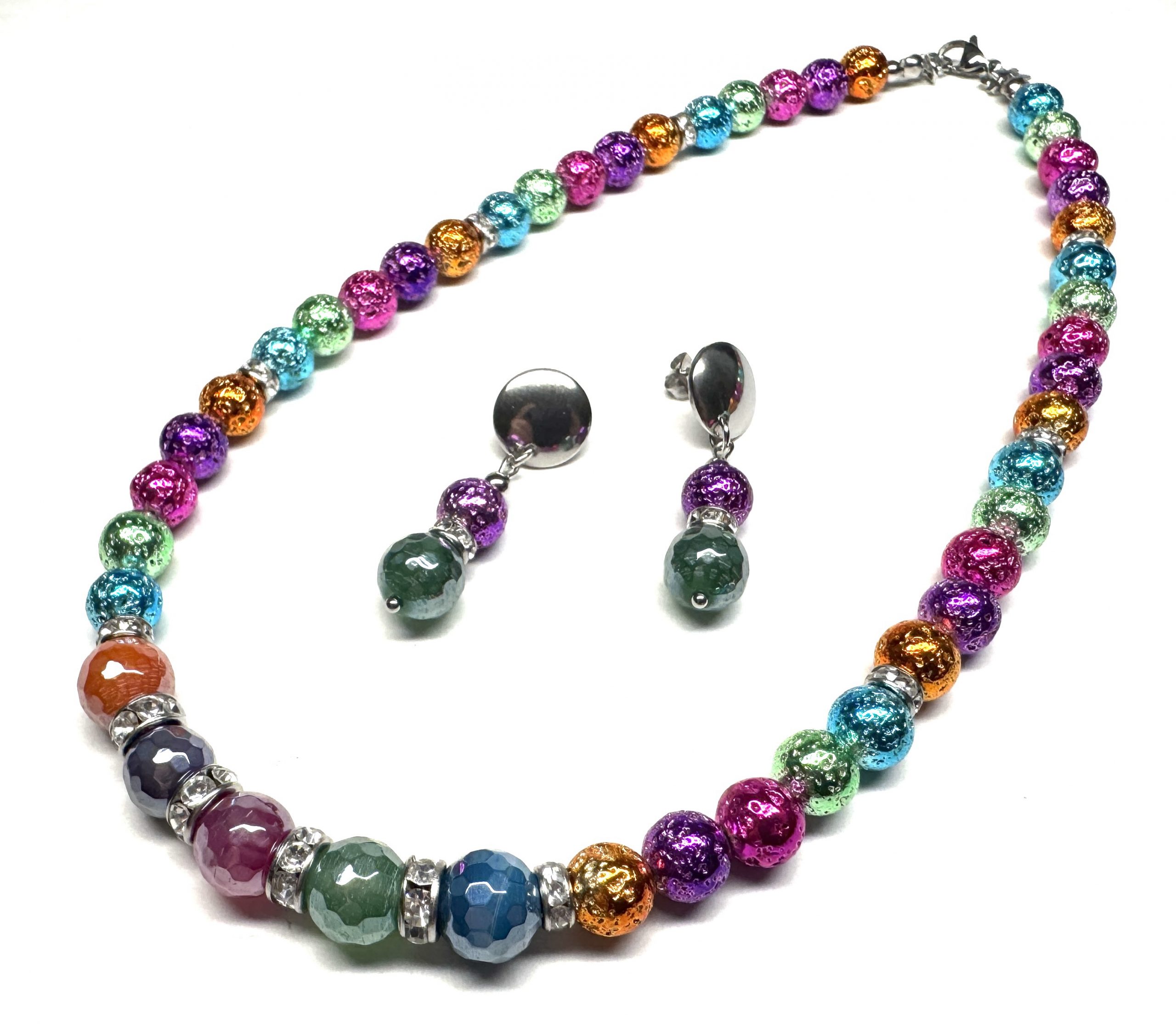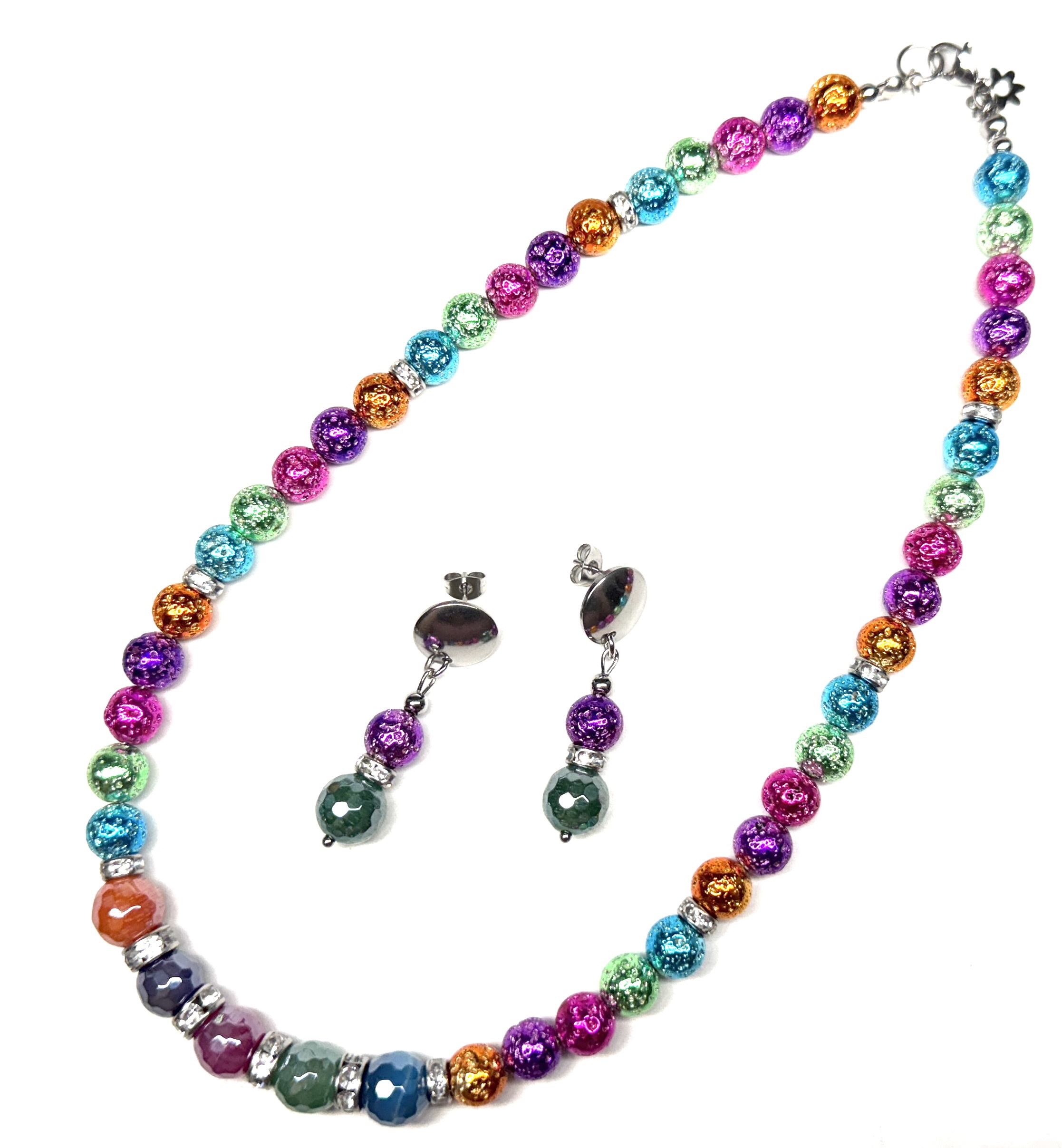 Auf Tiger Tail Draht gefädelte Kette und Ohrringe mit gefärbten Achat-, Lavastein- und mit Strass besetzten Edelstahlperlen. Karabinerverschluss, Ohrmutterverschluss.