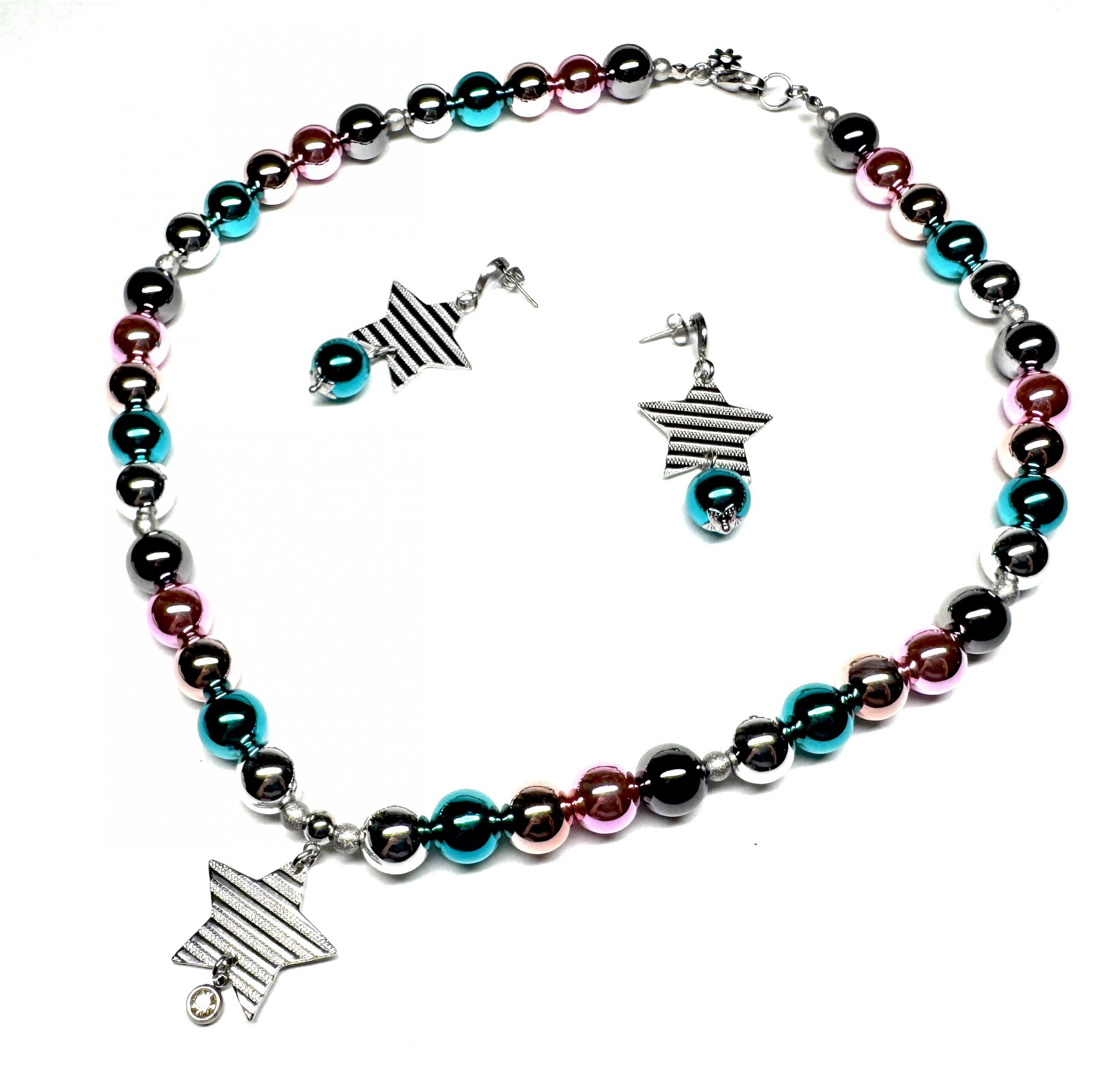 Set bestehend aus Halskette und Ohrringen mit großen, glänzenden Acrylperlen, strukturierten Edelstahlperlen, großen Sternen, Perlkappen und Strass-Anhänger aus Edelstahl. Karabinerverschluss, Ohrmutterverschluss.